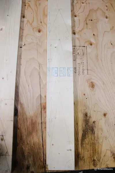 To begin, we took our first plank of spruce and found the centre point on one end. This will be the top of the first tree. Then we drew straight lines down to the bottom corners to mark out the base of the tree. We decided to vary our tree heights from 8-15 inches to create a foresty feel. Then we simply repeated the process by drawing different angled lines to achieve the different heights.